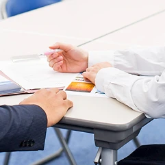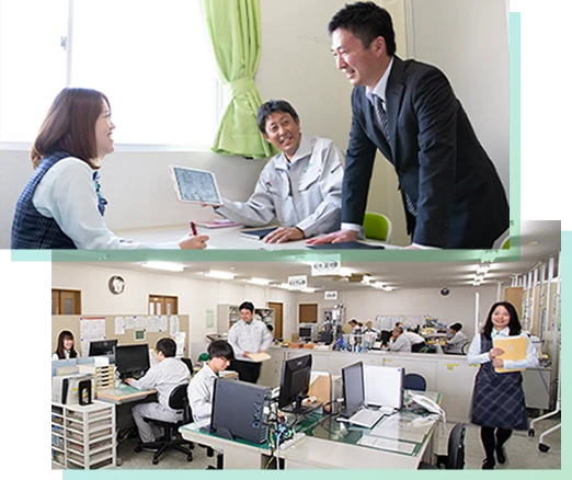 営業職、技術職の一日の仕事の流れ、社員みんなで仕事の効率改善を考える改善活動や、資格取得奨励制度によるキャリアアップなど教育制度や福利厚生をご紹介します。