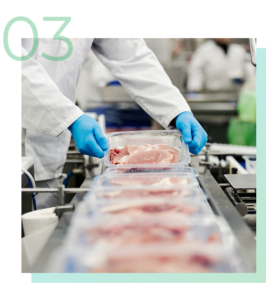 スーパーで手に取るお弁当やお菓子のパッケージは、食品工場の機械によって加工・包装されています。その機械の中で、私たちの部品が衛生的でスムーズな動作を支えています。